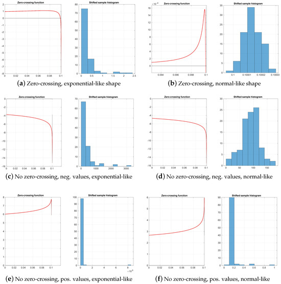 In our experiments, however, we found many cases where the function does not cross the abscissa, and therefore the estimation fails (examples of their typologies are shown in Figure 1). In these no-crossing cases, the value of the function at the bounds of the search region has the same sign—this suggests that a bisection algorithm [41] is the method of choice to find the zero-crossing, if there is any, since that must happen when both signs differ due to Bolzano’s theorem [42].