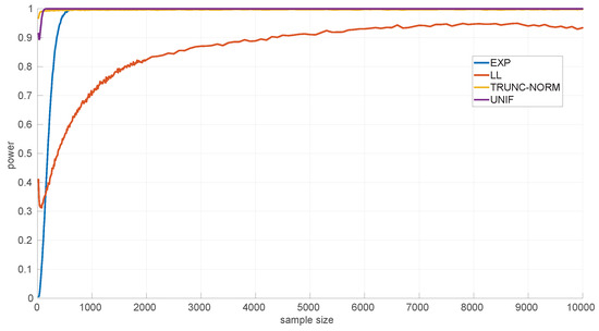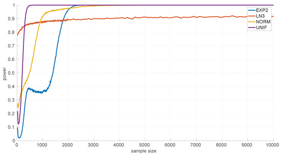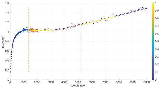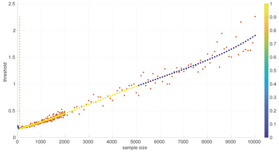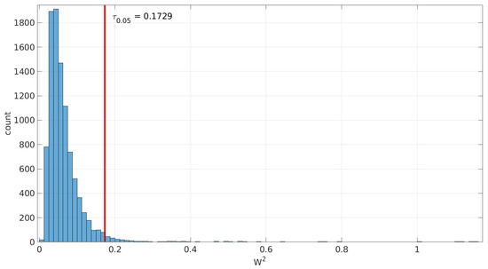 In the literature, we can find a significant number of goodness-of-fit methods based on statistical hypothesis testing [35]. In general, these methods first calculate a given statistic from the sample at hand, based on the assumption that the sample comes from a certain theoretical distribution (). Then they evaluate the probability that the statistic takes the calculated value or a larger one if the assumption is true—a right-tail test; if that probability falls below a given significance level or, in other words, if the statistic value is equal or larger than a certain threshold , then the null hypothesis can be rejected.