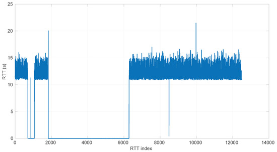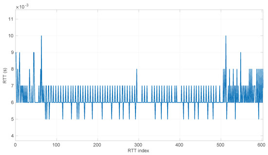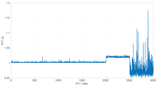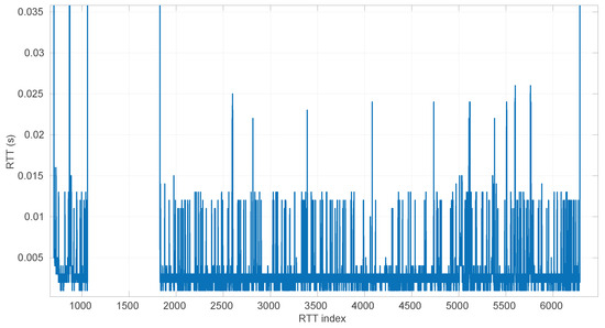 Closely related to Kalman Filters, Hidden Markov Models (HMMs) [27] are another option for RTT estimation. They are able to grasp the time dependencies in a sequence of time measurements and abrupt changes in regimes, but these benefits come at the expense of a significant computing cost for training the model. In particular, ref. [28] uses a Hierarchical Dirichlet Process HMM (HDP-HMM) to predict RTTs in the long term with a precise identification of changes and bursts in the signal. The model has a computation time of 5 s; thus it has to be recalculated at regular intervals; i.e., it works in batches of RTTs. In a robotics application like ours, the robot would work in an open loop from the previous model’s update for at least those 5 s, which can lead to a dangerous situation if in the meantime there is a downgrading or regime change in the transmissions. Other recent works on the use of HMMs in communication networks exist, but they usually deal with detecting abnormal conditions rather than modeling/forecasting transmission times [29].