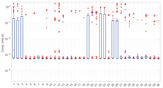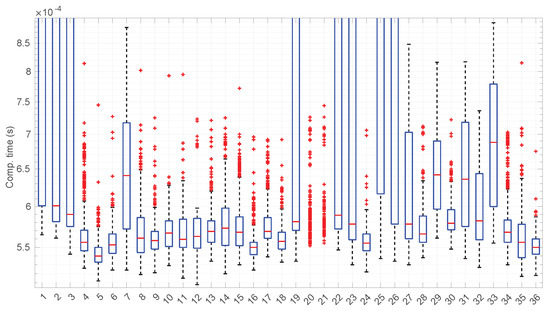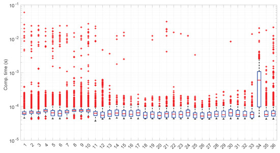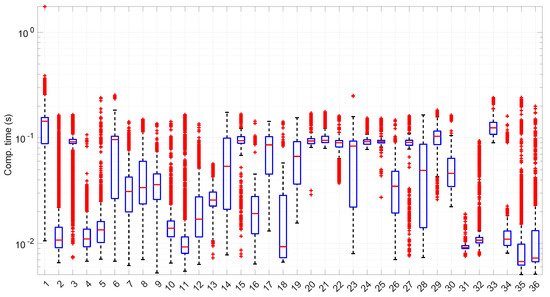 Computation time after reading each RTT value in the 36 scenarios of the dataset with the Log-logistic distribution. Note the logarithm scale in the ordinate axis. Here, the median computation times lie in the range [6, 200] ms.