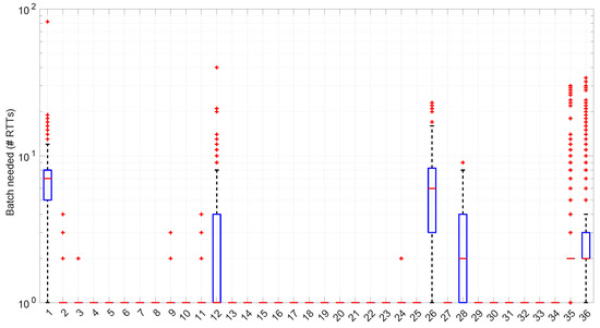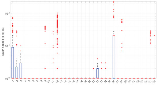The higher computational cost, however, does not worsen much the full online capabilities of the Log-logistic model with respect to the Log-normal model, as shown in Figure 43: now, 25 scenarios out of 36 can work with this distribution in a full online fashion, and the longer batch needed to assure no RTT is lost is , which is one order of magnitude smaller than the one for the Log-normal model.