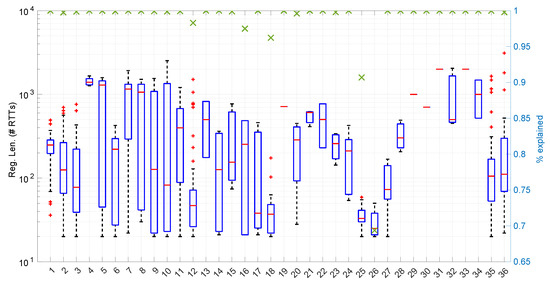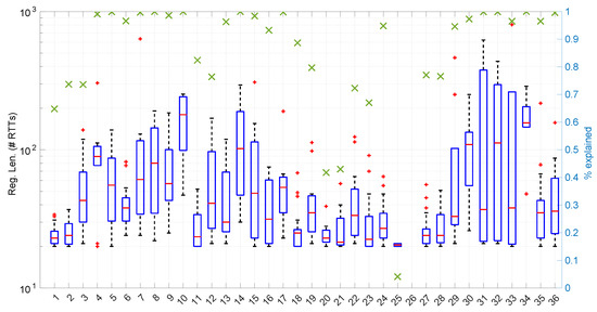 Regime lengths (boxplots, left axis) and percentage of explained RTTs (green crosses, right axis) after modeling and detecting changes in regimes in the 36 scenarios of the dataset with the Log-logistic distribution. Note that we have limited our experiments to scenarios of a maximum length of 10,000 RTTs.