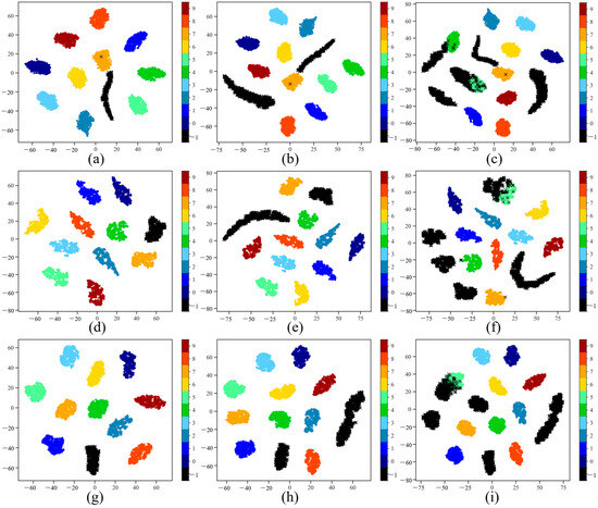 T-SNE visualization of feature distributions for different methods with K = 10 and N = 1, 3, 6. (a–c) SR2CNN; (d–f) TripletNet; (g–i) MTPL.