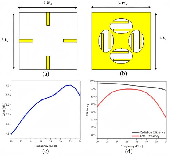 Compact elliptical slot mmWave MIMO antenna: (a) front view of antenna section, (b) back view of feeding section, (c) antenna gain, and (d) antenna efficiencies [15].