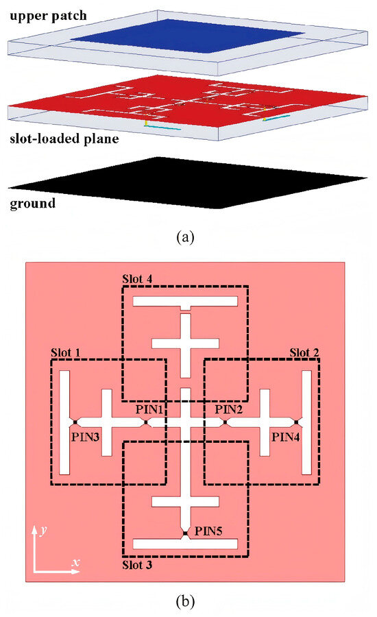 Structure of the proposed 2-bit RIS element: (a) exploded view; (b) detailed view of the slot-loaded plane [29].