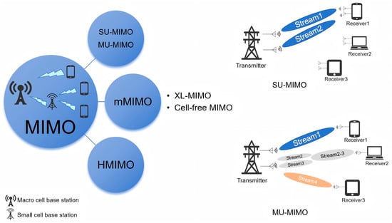 Spatial multiplexing enables the simultaneous transmission of multiple independent data streams, thereby increasing data rates. Spatial diversity improves link reliability by exploiting signal replicas over different propagation paths, reducing the bit error rate without increasing bandwidth or transmit power. Beamforming precisely controls the phase and amplitude of each antenna element to focus signal energy in specific directions, compensating for the high path loss characteristic of mmWave signals and reducing interference [37]. By using multiple transmitting and receiving antennas to simultaneously transmit multiple data streams, MIMO significantly enhances data rates and channel capacity. This technology not only increases system throughput but also improves link quality and reliability [38]. With technological advancements, MIMO has evolved into massive MIMO, significantly enhancing spatial multiplexing gains and improving link robustness. MIMO systems can be broadly categorized into four types, as demonstrated in Figure 6, each tailored to specific application scenarios and performance objectives.