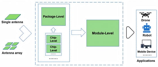 While antenna arrays have been mentioned in previous sections, this section provides a more detailed and systematic overview of their architecture, functionality, and role in mmWave communications. An antenna array consists of multiple radiating elements arranged in a predefined configuration, where the phase and amplitude of each element are controlled to achieve beamforming. This capability enables enhanced signal strength, improved spatial directionality, and dynamic adaptation to channel conditions, making antenna arrays a cornerstone technology for mmWave communications [26,27]. With the rise of large-scale MIMO systems, antenna arrays have become essential for realizing high-data-rate and low-latency wireless links in next-generation networks. The fundamental components of an antenna array include individual radiating elements—such as patch, waveguide, or Vivaldi antennas [28]—a feeding network (e.g., Butler matrices or T/R modules), a phase-shifting mechanism for beam steering, and a packaging structure that ensures mechanical protection and system integration. Key advantages of antenna arrays include their ability to provide high gain and directional radiation patterns, support intelligent beam management, improve spectral efficiency through spatial multiplexing, and meet the stringent requirements of enhanced mobile broadband (eMBB) and ultra-reliable low-latency communication (URLLC) scenarios. Notable applications include mmWave user equipment (UE), such as the external mmWave antenna module in the Motorola Moto Z3 smartphone; active antenna units (AAUs) in mmWave base stations from vendors like Nokia AirScale and ZTE; and airborne communication systems for high-speed unmanned aerial vehicles (UAVs), where stable mmWave links are critical. Despite their performance benefits, antenna arrays face several technical and practical challenges, including increased system complexity and power consumption, mutual coupling between closely spaced elements that degrades isolation, complicated calibration and synchronization mechanisms, and high manufacturing and deployment costs, which hinder their widespread adoption in cost-sensitive and compact devices. The following describes several promising solutions proposed in recent years.