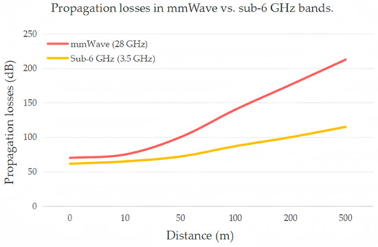 As 5G technology has evolved, the enormous volume of data traffic and the escalating demand for higher communication capacity and signal integrity have led to the near-total occupation of frequency bands ranging from several hundred MHz to several GHz [5]. To meet these growing demands for increased data rates, two primary approaches are typically considered: transitioning to higher frequency bands to expand bandwidth, or enhancing spectral efficiency through the use of advanced modulation schemes or multiplexing techniques such as MIMO technology. Millimeter-wave (mmWave), with wavelengths between 1 mm and 10 mm, corresponds to a spectrum spanning 30 GHz to 300 GHz. Although the physical definition of mmWave strictly refers to the 30 GHz-300 GHz band (wavelength 1–10 mm), the 20 GHz band is often included in the mmWave category in practical applications. The communications industry, such as 3GPP, uniformly categorizes the frequency bands above 24 GHz as 5G mmWave (FR2 band), for example, 24.25–27.5 GHz (n258) and 26.5–29.5 GHz (n257). mmWave has emerged as a critical candidate for 5G wireless systems due to their broad bandwidth and high transmission rates [6,7]. These attributes make mmWave well-suited to fulfill future capacity needs. Currently, mmWave technology is being utilized in various applications, including radar systems (such as automotive radars), military communications, satellite communications, and point-to-point (P2P) communications. Moreover, the adoption of mmWave in 5G networks not only promises to address the increasing bandwidth requirements but also paves the way for innovative services and applications that require ultra-high reliability and low-latency connectivity. This makes mmWave indispensable for realizing the full potential of 5G technology across different sectors.
