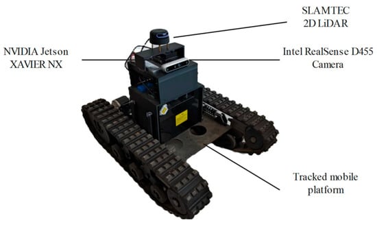 To validate the effectiveness of the proposed navigation system in pomegranate orchard environments, this study constructed an autonomous mobile platform as the experimental setup, as shown in Figure 2. The platform integrates an Intel RealSense D455 camera (Intel Corporation, Santa Clara, CA, USA), a SLAMTEC 2D LiDAR (Slamtec Co., Ltd., Shanghai, China), and an NVIDIA Jetson Xavier NX edge-computing module (NVIDIA Corporation, Santa Clara, CA, USA), and other equipment. The parameters of each component in the experimental platform are presented in Table 1.