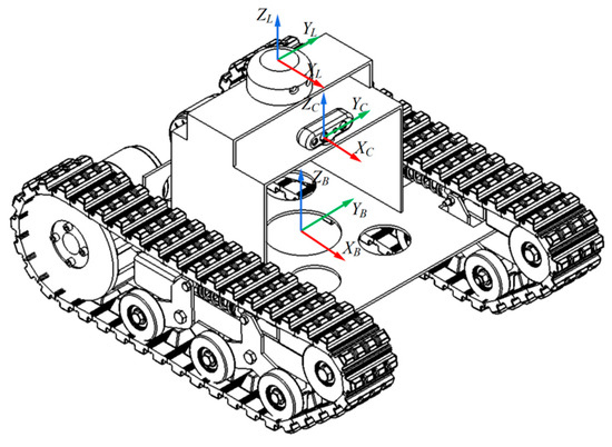 To achieve effective fusion of multi-sensor data, this study established a standardized coordinate system framework. The chassis coordinate system is defined as the reference coordinate system, with its origin located at the chassis center point at a height above the ground. The LiDAR coordinate system has its origin at the LiDAR scanning center at a height above the ground. The camera coordinate system has its origin at the RGB camera optical center at a height above the ground. All proposed coordinate systems follow the convention where the x-axis points toward the vehicle’s forward direction, the y-axis points toward the vehicle’s left side, and the z-axis points vertically upward in accordance with the right-hand rule. The LiDAR is mounted directly above the origin of the chassis coordinate frame, while the camera is spatially offset relative to the LiDAR. The precise relative pose between the two sensors is obtained via joint extrinsic calibration. The arrangement of the mobile chassis and the two sensors is shown in Figure 3.