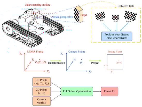 Extrinsic parameter calibration between the camera and LiDAR is a crucial step for achieving multi-sensor data fusion. As illustrated in Figure 4, this study proposes an extrinsic calibration method suitable for 2D LiDAR and camera systems. The method first obtains the pixel coordinates of the calibration board’s center point and its coordinates in the LiDAR coordinate system, then employs the PnP (Perspective-n-Point) algorithm to accurately solve the spatial pose relationship of the camera relative to the LiDAR.