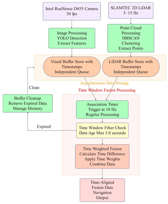 Due to the Intel RealSense D455 camera outputting RGB images at 30 fps and the SLAMTEC 2D LiDAR operating at a scanning frequency of 5–15 Hz, their respective data arrival intervals are 33.3 ms and 67–200 ms. Without appropriate temporal fusion processing, this would lead to incorrect calibration point correspondences, thereby affecting the solution accuracy of the PnP algorithm and producing erroneous spatial associations. As shown in Figure 5, a parallel approach is adopted to independently process Intel RealSense D455 camera data and SLAMTEC 2D LiDAR data, where visual features are extracted through YOLO detection algorithms and point cloud data undergoes DBSCAN clustering processing. Each sensor data stream is stored in independent circular buffers that retain timestamp information, eliminating the need for strict synchronization constraints. The system employs a 10 Hz timing-triggered data association mechanism between the two sensors, periodically retrieving data from both buffers within a 5 s time window, ensuring computational efficiency while guaranteeing access to fresh data. The system automatically removes expired data beyond the time window, ensuring the use of consistent stored data and preventing data accumulation.