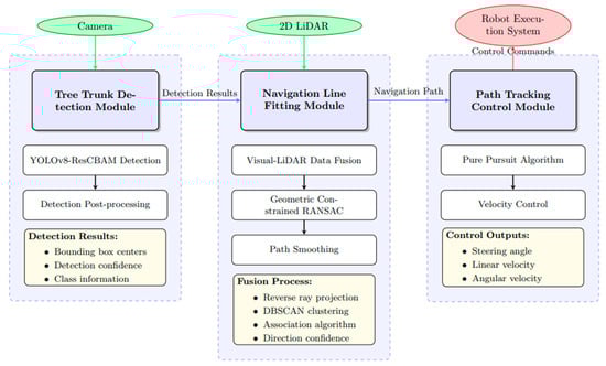The proposed vision and LiDAR fusion-based orchard navigation system adopts a modular design architecture, primarily comprising three components: trunk detection module, navigation line extraction module, and path tracking control. The overall system architecture is illustrated in Figure 6.
