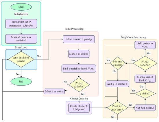 The DBSCAN algorithm workflow for pomegranate orchard environments is illustrated in Figure 7. The algorithm classifies a given point set into three categories:
