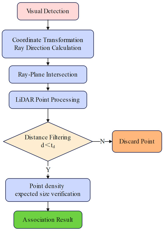 This paper proposes a vision and LiDAR data association algorithm that matches visually detected trunk points with LiDAR-clustered trunk point clouds. Unlike traditional data association methods that employ point cloud projection onto image planes, this study proposes a vision and LiDAR data association algorithm based on reverse ray projection. The core principle involves calculating the minimum distance between visual rays and LiDAR points and setting thresholds for association. The algorithm workflow is illustrated in Figure 8.