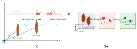 Schematic diagram of the association algorithm: (a) Geometric principle—the camera ray intersects the LiDAR height plane ({z=h}_{lidar}); items within the distance threshold \delta are shown in green (successful association), whereas those beyond \delta are in red (failed association). (b) Association process—the blue dashed line denotes the reverse ray projection from the camera optical center through each 2D trunk detection; LiDAR points close to this ray are highlighted in red as candidates, gray dots indicate background returns, and the finally associated trunks are shown in green.