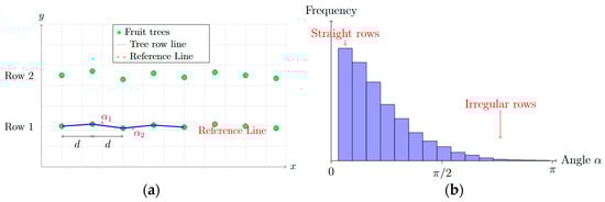 To address the problem of traditional RANSAC algorithms being susceptible to noise in orchard environments, this study introduced a geometric constraint algorithm that guides the line fitting process by analyzing geometric relationships between fruit trees and constructing angle histograms. Experimental results show that compared to traditional RANSAC algorithms, the geometric constraint algorithm improved fitting accuracy by 2.4%, inlier ratio by 5.1%, and computational efficiency by 47.06%. The primary reason for performance improvement lies in the geometric constraint mechanism’s full utilization of prior knowledge about pomegranate orchards. Fruit tree rows in pomegranate orchards are typically planted along the same direction, and this regularity provides powerful constraints for the algorithm. By constructing direction histograms and extracting principal direction angles, the algorithm can preferentially select candidate lines that conform to orchard planting patterns during the fitting process, thereby improving real-time efficiency and stability of fitting.