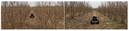 Compared with other orchards, pomegranate orchards exhibit distinct environmental characteristics and operational challenges. At the young-tree stage, trunk diameters are only 5–15 cm, and the planting density is high, with a row spacing of 2–3 m and an in-row spacing of 1–2 m, as shown in Figure 1. Beyond the spatial layout, ambient conditions directly affect both experiments and algorithm performance: fluctuations in temperature and humidity broaden the image luminance dynamic range; strong direct sunlight and dappled canopy shadows cause unstable image contrast and textures, increasing the difficulty of trunk detection; the ground surface contains both bare soil and weeds, and the soil is predominantly sandy loam—under dry conditions dust is raised, whereas under wet conditions water-surface glare and wheel slip further degrade the measurement quality of the camera and LiDAR. These climate, soil, and ground-surface factors, compounded with the high-density planting structure, impose more demanding operating conditions than typical orchards, making autonomous navigation more challenging in object perception, robust fitting, and path tracking [4,5].