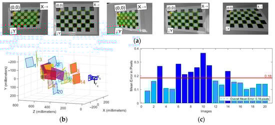Camera intrinsic parameter calibration was performed using Zhang’s calibration method [38], employing the Camera Calibrator toolbox in MATLAB (2021b). The checkerboard grid used featured 8 × 5 inner corner points, with each square having a side length of 27 mm. As shown in Figure 4, checkerboard images were captured under different poses, and the camera’s focal length, principal point coordinates, radial distortion coefficients, and tangential distortion coefficients were calculated using functions provided by the OpenCV (3.3.1) library. The calibration process was repeated multiple times, and average values were taken to improve accuracy. The camera intrinsic parameter matrix is shown in Equation (1).
