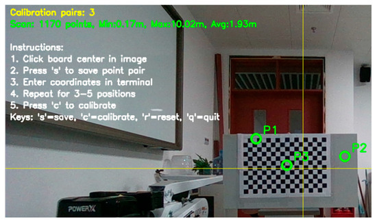 Based on the aforementioned mathematical model and algorithm workflow, precise extrinsic calibration between the camera and 2D LiDAR can be achieved. This method establishes a complete coordinate transformation chain from the LiDAR coordinate system to the camera coordinate system and then to the pixel coordinate system. By utilizing the PnP algorithm to solve for the rotation matrix and translation vector , the relative position of the camera with respect to the 2D LiDAR is computed, thereby achieving precise alignment of data from both sensors within a unified coordinate system.