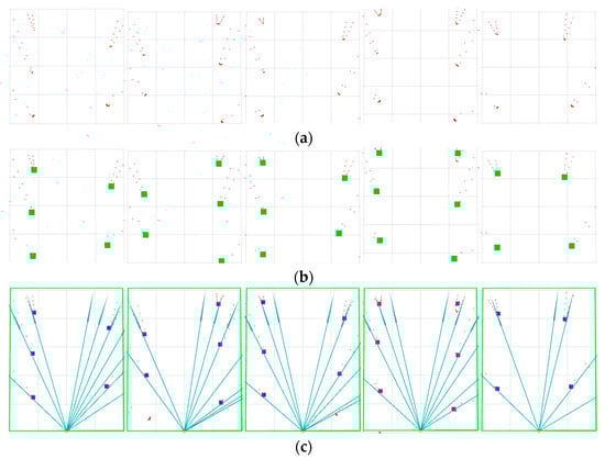 Raw measurements are first limited to the [1,1.5] m range window according to the orchard row spacing, removing near- and far-field non–tree-row interference. Following the scan order, a median filter with window width k = 5 is applied to the point-cloud ranges to obtain . When holds, the sample is regarded as a spike and replaced with . This step effectively suppresses non–tree-row clutter and sporadic outliers, providing a cleaner point set for DBSCAN.