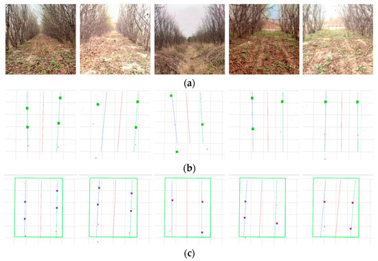 The experimental results are shown in Figure 17, displaying the navigation line fitting results of three algorithms under five experimental conditions.