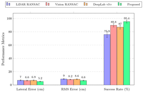 As shown in Figure 18, a grouped bar chart provides an intuitive comparison of the navigation-line extraction performance of the different methods. The experimental results validate the effectiveness of the proposed vision and 2D LiDAR fusion-based approach in practical applications, offering a more feasible solution for agricultural automation.