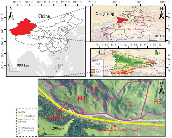 The research area is situated in the Xinjiang Uyghur Autonomous Region, covering parts of Xinyuan County in the Ili Kazakh Autonomous Prefecture and Hejing County in the Bayingolin Mongolian Autonomous Prefecture, deep in the Tianshan Mountains, extending west to east with complex topography, well-developed river systems, gully networks and incised terrain. Adverse geological conditions, such as landslides, pose significant risks to road safety and personnel. As depicted in Figure 1, the landslide is located on the right bank (downstream) of the Gongnaisi Valley along the G218 National Highway at coordinates 8446′17.3″ E, 4313′19.1″ N, featuring a banana-leaf-shaped planar morphology and a chair-like back scarp, divisible into four primary zones, with a rear escarpment height of approximately 30 m, a main axis length of approximately 1460 m, and a principal sliding direction of 233.