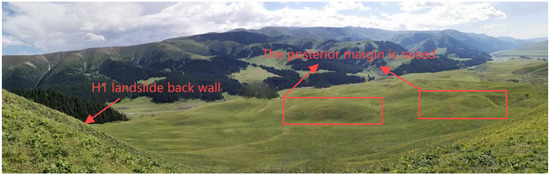 The geometric morphology of landslides is characterized by their planar distribution and profile structure, collectively constituting their spatial identification markers [30]. The planar forms generally exhibit a distinctive “armchair” or tongue-like structure, where the arcuate boundary of the posterior margin contrasts dramatically with the tongue-shaped extension of the leading edge in the primary sliding direction [31]. Taking the Aken Daban H1 landslide as an example (Figure 2), its unique “plantain fan shape” planar distribution features a lateral width of up to 60 m and a longitudinal extension of approximately 70 m, with a main sliding azimuth of 30°, revealing the control of regional tectonic stress fields on the development direction of the landslide. The profile morphology is defined by a typical four-element structure: the steep inclination of the rear scarp typically surpasses 60°, and the thickness of the landslide body demonstrates significant spatial variation (the thickness of the H1 landslide varies from 8.1 to 14.9 m).
