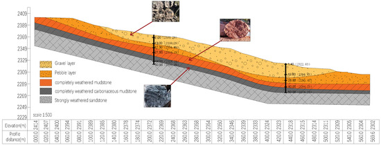 The three-dimensional spatial layout of landslide formations significantly influences deformation and evolution. As shown in Figure 3, the slip zone consists of completely weathered carbonaceous mudstone acting as a weak interlayer, underlain by stable, strongly weathered sandstone bedrock, which forms the slip bed and facilitates slip surface development. The landslide body, particularly in the H1 case, was composed of a heterogeneous mix of boulders, gravel, and weathered mudstone in its upper portion, with high spatial variability. With a permeability coefficient of approximately , this material is highly susceptible to matric suction loss during rainfall. Combined with the fault zone influence, these conditions may trigger shallow landslides, as illustrated in Figure 4.