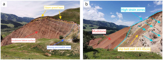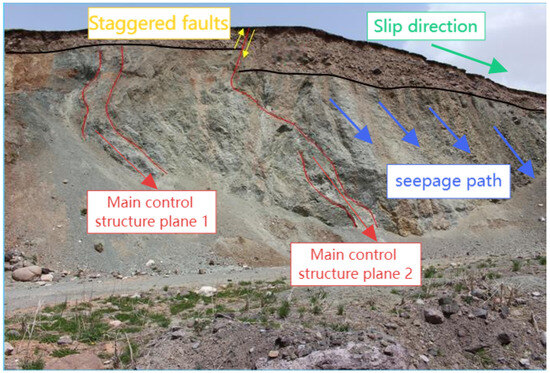 As shown in Figure 7, the major regulating interface of the landslide is the contact zone between the weak carbonaceous mudstone interlayer (highlighted by the red dashed line in the image) and the overlying severely weathered rock mass. This sliding surface (a) exhibited a terraced morphology owing to faulting, which resulted in a considerable drop in shear strength along this plane.