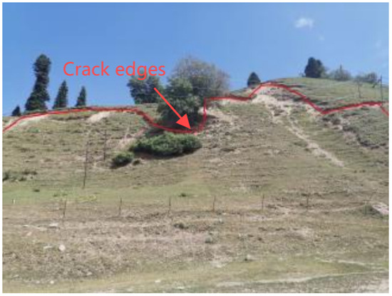 The surface deformation field is a vital representation of landslide dynamics. The formation of tension crack networks at the back edge has substantial consequences for different evolutionary stages [32]. As shown in Figure 6, in the instance of H3 landslide, the fracture propagation rate near the 30-m-high scarp at the rear wall reaches 2 cm/day. These cracks extended at an intersection angle of 85°–95° relative to the major sliding direction, commensurate with the orientation of the maximum principal stress under plane strain conditions.