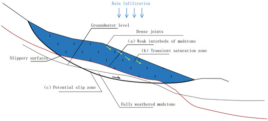 The joint-rich zones indicated by the yellow arrows further improve rock mass fragmentation, providing favorable channels for rainfall infiltration. Seasonal precipitation infiltrates through surface fissures and collects at the top of the mudstone layer, generating a transitory saturated zone (b), as represented by a blue-shaded area.
