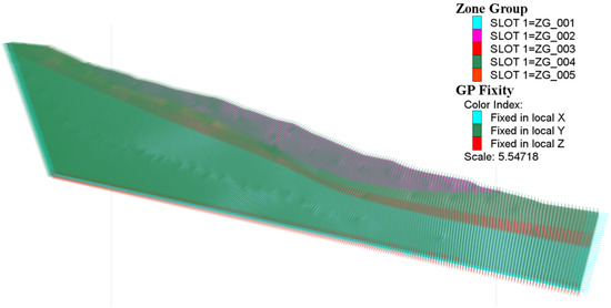 A consistent mesh with a grid spacing of 0.5 m was produced throughout the model. Using the zone group command, the model was separated into five discrete layers, with the boundary between the gravel and completely weathered mudstone layers explicitly designated as the weak shear zone.