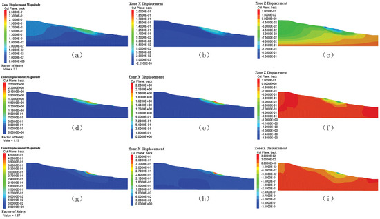 Displacement analysis: (a) total displacement of the natural state; (b) horizontal displacement of the natural state; (c) vertical displacement of the natural state; (d) total displacement of scenario 1; (e) horizontal displacement of scenario 1; (f) vertical displacement of scenario 1; (g) total displacement of scenario 2; (h) horizontal displacement of scenario 2; (i) vertical displacement of scenario 2.
