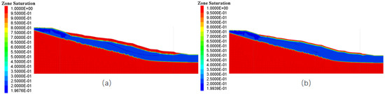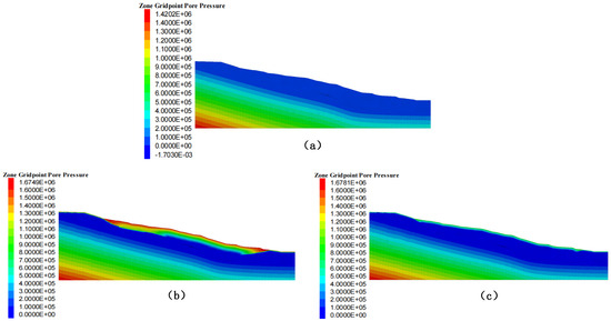 The FLAC3D 7.0 simulation results (Figure 10) revealed the spatiotemporal evolution patterns of the pore water pressure in the slope under different rainfall intensities.