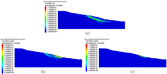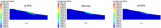 As shown in Figure 9, the overall displacement magnitude of the slope under natural conditions exhibited a non-uniform distribution, with peak values concentrated near the surface. The highest total displacement at the crest was 14.2 mm, and it steadily diminished with increasing depth, approaching zero beyond 25 m. This pattern suggests the presence of a shallow deformation zone, predominantly dominated by surficial plastic flow. The safety factor determined from the analysis was 2.2, which, according to conventional geotechnical engineering criteria (safety factor > 1.5), indicates that the slope remains in a minimally stable condition.