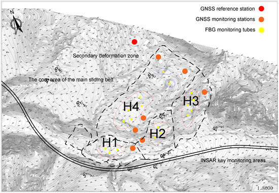 The design of a landslide monitoring plan must be based on a thorough understanding of the geological properties and dynamic evolution mechanisms of the slope to ensure scientific validity and effectiveness. Taking the H1 landslide as an example, its layered structural features and poor mechanical properties of the slip zone—characterized by cohesion and internal friction angle —indicate that the slope is in a condition of critical stability.