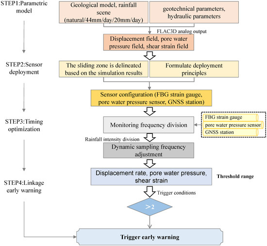To address this key challenge, this study proposes an integrated framework that innovatively utilizes the FLAC3D 7.0 numerical simulation for spatiotemporal and multiparameter monitoring. Specifically, the framework dynamically couples the seepage and stress fields to analyze complex mechanical responses and hydrological processes within slopes, thereby optimizing multi-sensor deployment strategies. Through simulation analyses under various rainfall scenarios in the Tianshan Mountains, China, this study achieved the following objectives: (1) identification of high-risk zones based on displacement, pore water pressure, and strain fields to enable precise spatial optimization of sensor layouts; (2) introduction of a rainfall-triggered adaptive sampling mechanism that increases the sampling frequency to 10 Hz during heavy rainfall to capture transient critical signals; and (3) establishment of a multiparameter early warning mechanism that integrates displacement, pore water pressure, and strain thresholds to enhance warning accuracy. The FLAC3D 7.0 framework not only resolves spatiotemporal heterogeneities within the rock and soil mass (such as variations in permeability and stress concentration zones) and tracks transient saturation fronts during the unsaturated-saturated transition, but also enables high-resolution monitoring of pore pressure, displacement and shear strain. This facilitates an optimized sensor configuration and effectively reduces the false alarm rate. This approach significantly enhances the capability to capture critical hydro-mechanical transition processes while reducing monitoring redundancy, offering a scientific, reliable, and forward-looking technical solution for slope disaster risk prevention and management [26].