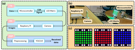 System architecture and experimental setup: (a) Corresponding block diagram illustrating the system components and data flow; (b) experimental setup used for data acquisition; (c) colors on the LED matrix.