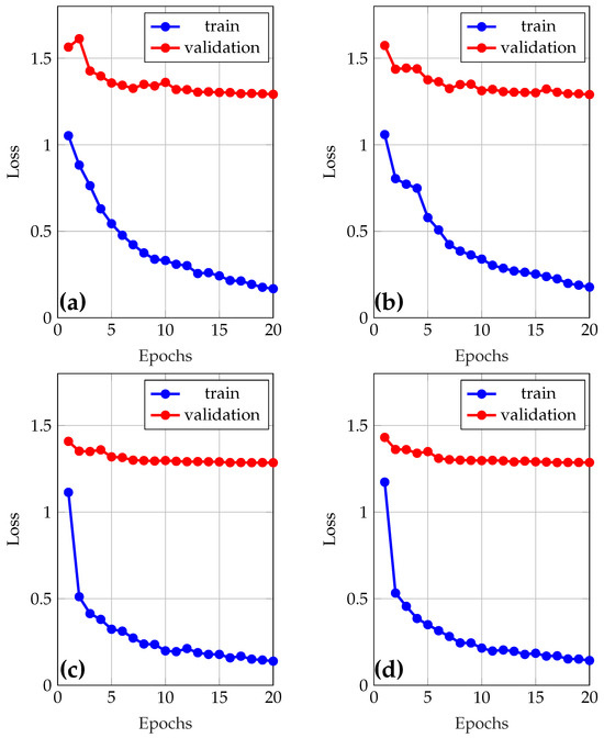 Table 5 presents the loss and accuracy results in the validation set for the various training runs performed during this process. This table facilitates the identification of the best hyperparameter settings for the classification task. In this table, the lowest loss value and the highest level of accuracy achieved during the epochs of the validation stage are presented. The validation curves (accuracy and loss vs epochs) for the reported data are shown in Figure 5.