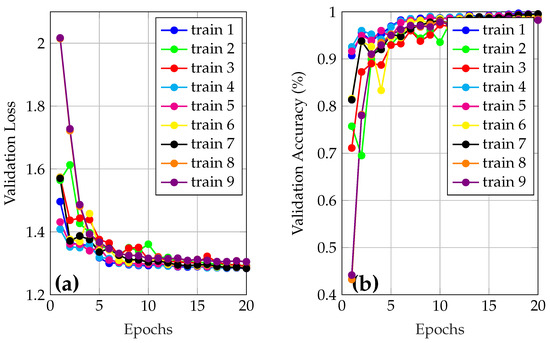 In Figure 5a, the blue curve (train 1), corresponds to the best model and presents a low loss in most epochs, starting at and reaching a minimum of . The curve shows a decline until the sixth epoch, where the loss stabilizes around . On the other hand, in Figure 5b, it is observed that the accuracy starts , and achieves after 20 epochs. This indicates, at first glance, that the model has outstanding performance even with a reduced number of iterations.