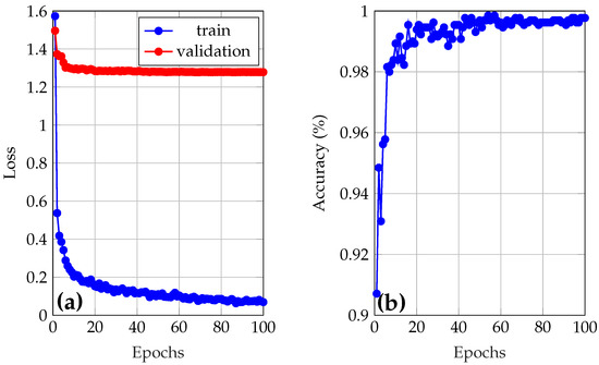 When analyzing the learning curves of the best model, trained for 100 epochs, in Figure 6a, a marked discrepancy between training loss and validation loss is observed. The training loss decreases rapidly, reaching very low values, while the validation loss remains significantly higher in comparison. However, it is seen that both losses could continue to decrease by further training the model using more epochs, suggesting that the model is not overfitting. Figure 6b shows a high validation accuracy throughout the epochs. The accuracy increases rapidly during the first epochs and stabilizes at values close to 98–99%. This high validation accuracy, combined with a high validation loss, could preliminarily indicate that the model makes correct predictions in most cases, but with low confidence in its classifications. That is, the model assigns lower probabilities to the correct classes, which is penalized by the loss function without affecting the overall accuracy. However, when analyzing the probabilities associated with each sample during validation, it was confirmed that this is not the case, as all samples were classified with reliabilities higher than .