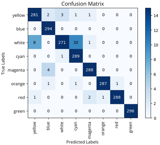 The samples in each class were correctly classified with high accuracy and, overall, the model demonstrated a high generalization ability with an accuracy of 98.4% in the test set. The confusion matrix, therefore, not only confirms the strong overall performance of the model but also provides a nuanced understanding of its limitations. The strong concentration of correct predictions along the main diagonal, notably for classes like blue and green (with 294 and 296 correct predictions, respectively), demonstrates effective generalization under real testing conditions. However, the confusion between white, cyan, and yellow highlights the inherent physical constraints of the optical camera communication system, such as channel crosstalk and sensor saturation, when processing colors requiring high intensity across multiple RGB channels. Minor misclassifications, like magenta being confused with blue, further reinforce these.