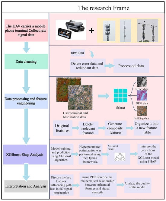 In Figure 1, the whole workflow includes the collection of raw data by using the mobile phone carried by the UAV, and then the data cleaning of the raw data, including the deletion of erroneous data and redundant data. Next, data engineering is carried out on the data, and the processed user data and the base station data provided by the operator are combined with normalized difference vegetation index (NDVI) data, digital elevation model (DEM), data and building data for feature fusion and deletion of irrelevant features. Then, the existing features are generated for feature generation and all the processed features are integrated into fishnets. The data were imported into the XGBoost–SHAP model for analysis. XGBoost was used for model training, the Optuna framework was used for hyperparameter tuning, and then SHAP was used for interpretability analysis. Finally, the PDP was used to linearly analyze the key features that affect the model and then explain which main features affect the signal propagation.