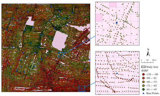 The study area encompassed a square region measuring 3 km by 3 km surrounding the graduate dormitories of Chongqing University of Posts and Telecommunications, located in Yinglong Town, Nan’an District, Chongqing (Figure 2). Field measurements of 5G signals were collected, including reference signal received power (RSRP), reference signal received quality (RSRQ), signal-to-interference-plus-noise ratio (SINR), the elevation of measurement points, and corresponding base station cell global identity (CGI) data. Sampling was conducted using a smartphone equipped with the professional network testing tool Cellular Pro (developed by alibaba1126, Haidian District, Beijing, China), which was mounted on a drone. A total of 58,771 measurement points and 174 base station points were recorded. The smartphone utilized a Snapdragon X60 5G (developed by Qualcomm Incorporated, San Diego, CA, USA) modem as its baseband processor, and the data were integrated with macrocell data provided by China Unicom. Figure 2 illustrates the distribution of collected signal point data and computing unit cells.