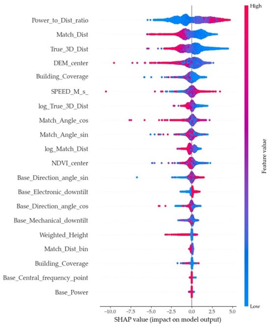 First, propagation-related variables are central to modeling wireless signal behavior. For instance, features such as Power_to_Dist_ratio, Match_Dist, True_3D_Dist, log_Match_Dist, and log_True_3D_Dist are derived through multimodal data fusion and directly reflect the influence of signal propagation distance and transmission power on received signal strength. Among these, Power_to_Dist_ratio—an integrated variable combining both power and distance effects—emerged as the most influential contributor to the model’s performance.