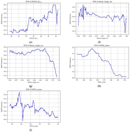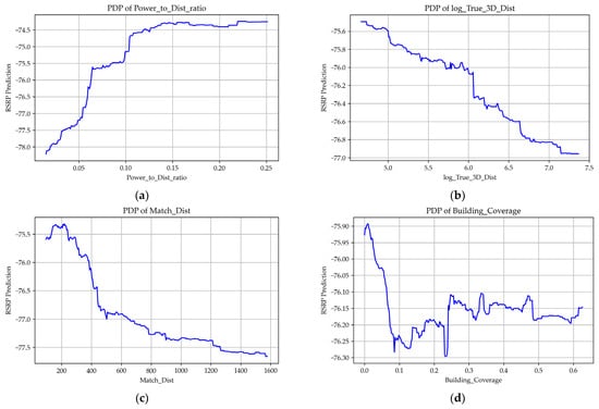 Through partial dependence plot (PDP) analysis, we further interpreted the model’s prediction results. The plots revealed the trends of influence of key features on path loss.