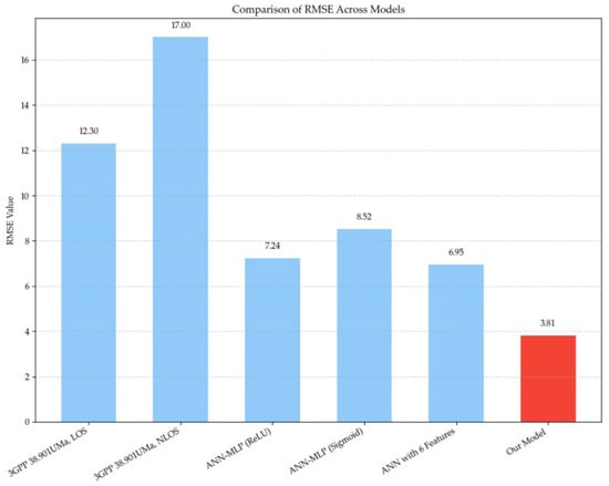 In Table 3 and Figure 7, it can be observed that the proposed XGBoost-based prediction framework in this study achieves a substantially lower RMSE compared to other benchmark models, demonstrating its superior predictive capability. This performance gain can be attributed to the integration of multimodal features that comprehensively capture physical, environmental, and network-related factors influencing signal propagation. Furthermore, the adoption of systematic feature engineering—incorporating directional transformations, high-order interaction terms, and categorical encodings—enables the model to better represent the complex, nonlinear relationships inherent in 5G path loss. As a result, the proposed approach delivers more accurate and robust path loss predictions, offering tangible benefits for network planning and optimization, particularly in challenging urban and mountainous terrains.