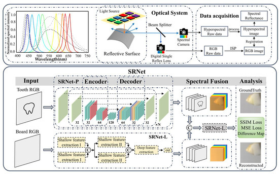 Prior to Equation (7), SRNet-P reconstructs the hyperspectral image from the tooth sample’s RGB image, while SRNet-L reconstructs the hyperspectral image from the light-source image. These two hyperspectral outputs are concatenated along the channel dimension and then fed back into SRNet-L to extract spectral information for decoding, ultimately yielding the final spectral reflectance.